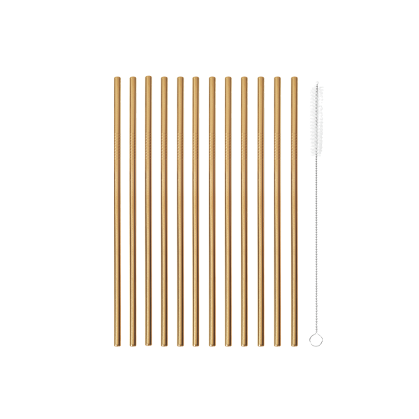 Set de 12 pailles inox Ø0,6 cm avec finition cuivre, accompagnées d’une brosse de nettoyage. Une alternative durable et élégante pour cocktails et softs.