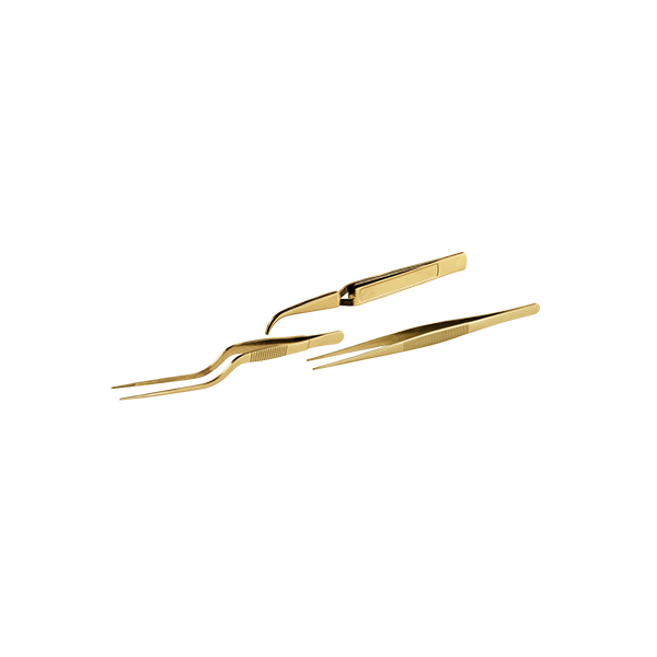 Lot de 3 pinces de précision finition or, idéales pour garnitures cocktail, dressage minute et travail de précision en mixologie et gastronomie.