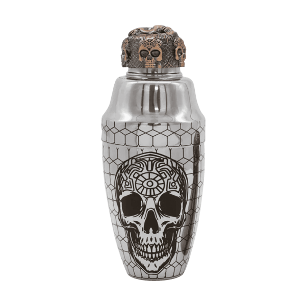 Shaker cocktail 500 ml en acier inoxydable, design tête de mort, composé de 3 pièces. Idéal pour bars à cocktails recherchant un style fort et distinctif.