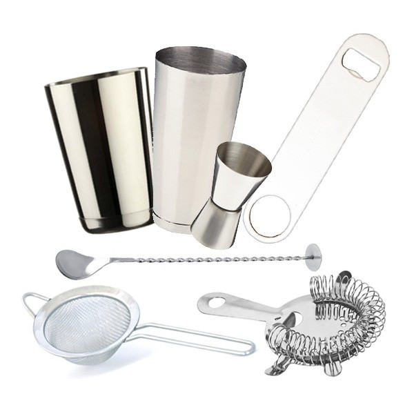 - 1 Shaker Boston plombé 28oz Inox - 1 Speed cup Inox 20oz - 1 jigger 2/4cl Inox - 1 strainer Inox (4 languettes) - 1 passoire à cocktails Inox - 1 speed opener Inox - 1 cuillère à mélange Inox bout plat
